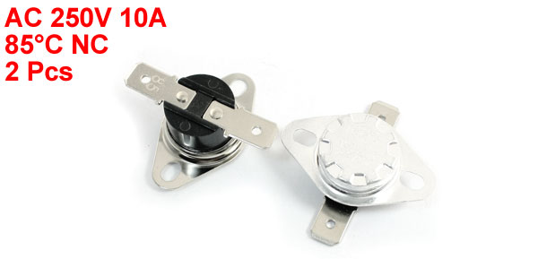 Details2pcs KSD301 85C Celsius NC Temperature Control Switches AC250V 10A  Product Name Temperature Control Switch Model.No KSD301 Action Type Normally Closed(NC) Action Temperature 85°C Voltage & Current AC 250V, 10A Total Size (Each) 34 x 18 x 12mm / 1.3" x 0.71" x 0.47"(L*W*H) Mounting Hole Size 4.5 x 3.5mm/0.18" x 0.14"(L*W) Material Metal, Plastic Color Black, Silver Tone Total Weight 10g Package Content 2 x Temperature Control Switches