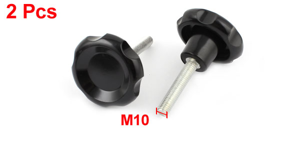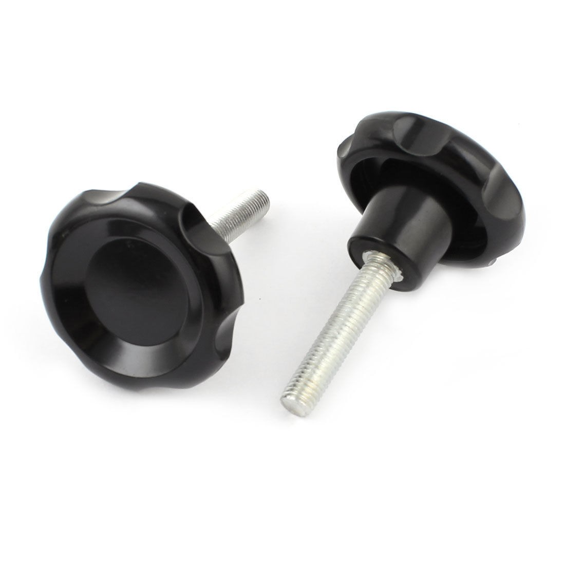 Product Name Clamping Screw Knob Feature Star Shaped Head Diameter 60mm/2.4" Thread Size 10 x 50mm/0.4" x 2"(D*L) Total Height 90mm/3.5" Material Metal, Plastic Color Silver Tone, Black Weight 170g Package Content 2 x Clamping Screw Knob