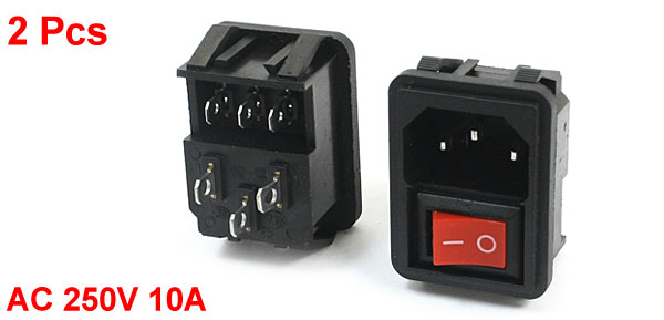 2Pcs Male Power Connector Plug AC250V 10A + Red Rocker Switch