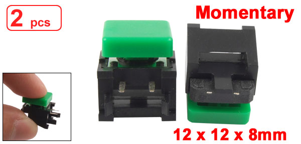 Product Name Tact Switch Contact Type Momentary Dimension 12 x 12 x 8mm/ 0.47" x 0.47" x 0.31" (L*W*H) Overall Size 18 x 13 x 15mm/ 0.7'' x 0.51'' x 0.59'' (L*W*H) Button Dia. 12mm/ 0.47" Pin Pitch 5mm/ 0.2" Pin Length 5mm/ 0.2" Material Plastic, Metal, Electric Parts Color Green, Silver Tone Net Weight 4g Package Content 2 x Tact Switches - Reviews