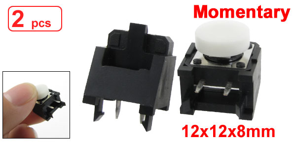 Product Name Momentary Tactile Switch Action Type Momentary Switch Size(Include Cap) 12 x 12 x 8mm/0.47" x 0.47" x 0.31'' (L*W*H) Dimension 20 x 13 x 14mm / 0.79" x 0.51" x 0.55" (L*W*H) Button Diameter 10mm / 0.39" Pin Pitch 5mm / 0.2" Pin Length 4mm / 0.16" Material Plastic, Metal, Electric Parts Main Color Black, White Net Weight 3g Package Content 2 x Momentary Tactile Switch - Reviews