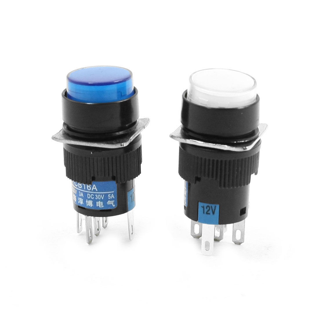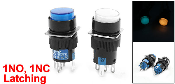 Item Name Push Button Switch Contact Type 1NO, 1NC Switch Type Latching Type Switch Working Voltage AC 250V, 3A Lamp Voltage DC 12V Lamp Cap Color Blue, White Switch Color Blue, White, Black Pin Number 5 Button Cap Diameter 15mm/ 0.59" Mounting Thread Dia. 16mm/ 0.63" Total Size 18 x 18 x 38mm/ 0.71" x 0.71" x 1.6"(L*W*H) Material Plastic, Electronic Parts Weight 10g Package Content 2 x Push Button Switch - Reviews