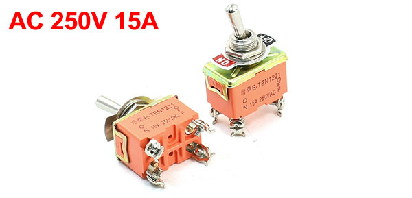 Details2PCS Panel Mount ON/OFF DPST 4 Pin Latching Toggle Switch AC 250V 15A  Product Name Toggle Switch Rating AC 250V 15A Pin Number 4 Terminals Position 2 Position (On/Off) Type DPST, Latching Screw Diameter 12mm/0.47" Total Size(Approx.) 5.5 x 3 x 2cm / 2.2" x 1.2" x 0.8"(L*W*T) Material Plastic & Metal Color Orange & Silver Tone Weight 70g Package Content 2 x Toggle Switch