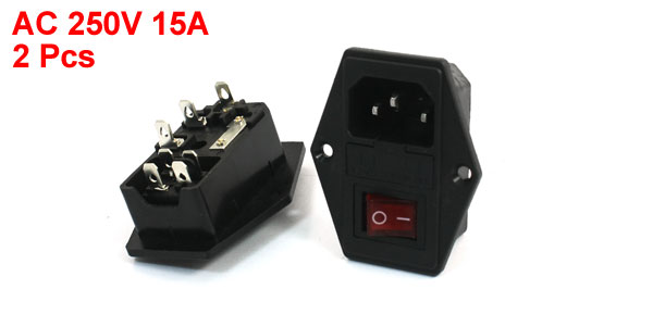 Product Name Power Socket Plug Type IEC320 C14 Voltage & Current 15A 250V AC Light Color Red Rocker Switch Type 4Pin DPST Fit Fuse Size 5 x 20mm/ 0.2" x 0.79" (L*W) Total Socket Size 5.8 x 4.8 x 3.3cm/2.3" x 1.9" x 1.3"(L*W*T) Mount Size 4.8 x 2.7cm/1.9" x 1"(L*W) Material (External) Plastic, Metal Main Color Silver Tone, Black Weight 52g Package Content 2 x Power Socket w Fuse Holder w Rocker Switch