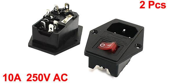 Details2Pcs Red Lamp Rocker Switch Fuse Holder IEC320 C14 Inlet Power Socket AC250V 10A  Product Name Power Socket Plug Type IEC320 C14 Voltage & Current 10A, 250V AC Light Color Red Fit Fuse Size 5 x 20mm/ 0.2" x 0.79" (L*W) Total Socket Size 5.8 x 4.8 x 2.8cm/2.3" x 1.9" x 1.1"(L*W*T) Mount Size 4.5 x 2.5cm/1.8" x 1"(L*W) Material (External) Plastic, Metal Main Color Red, Black Weight 51g Package Content 2 x Power Socket w Fuse Holder w Rocker Switch