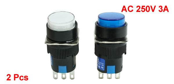 Item Name Push Button Switch Contact Type SPDT, 1NO, 1NC Switch Type Momentary Type Switch Working Voltage AC 250V, 3A Switch Color White, Blue Pin Number 3 Button Cap Diameter 15mm/ 0.59" Mounting Thread Dia. 16mm/ 0.63" Total Size 18 x 18 x 38mm/ 0.71" x 0.71" x 1.6"(L*W*H) Material Plastic, Electronic Parts Weight 10g Package Content 2 x Push Button Switch  - Reviews