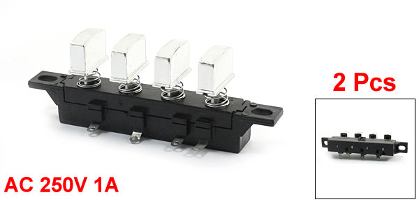 Product Name Interlock Push Button Switch Model KQ-4 Type 4 Keys 3 Poles Button Number 4 Voltage/ Current AC 250V 1A Overall Size 104 x 22 x 40mm/ 4" x 0.87" x 1.6" (L*W*H) Mount Hole Size 7.5 x 5mm/ 0.3" x 0.2"(L*W) Push Button Size(Each) 2 x 0.65cm/0.8" x 0.25" (L*W) Material Plastic, Metal, Electronic Part Color Black, Silver Tone Net Weight 53g Package Content 1 x Interlock Push Button Switch - Reviews
