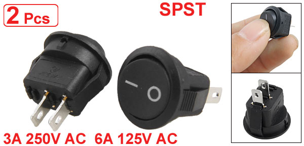 Product Name Rocker Switch Poles SPST Terminals 2 Pin (On - Off) Rating Voltage 3A 250V AC 6A 125V AC Total Size(Each One) 1.7 x 2.3cm / 0.7" x 0.9"(D*T) Mount Hole Diameter 1.5cm / 0.59" Color Black Material Plastic & Metal Total Weight 4g Package Content 2 x Rocker Switch - Reviews