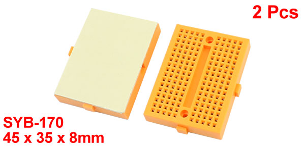 Product Name Solderless Breadboard Model SYB-170 Color Yellow Size 45 x 35 x 8mm / 1.8" x 1.4" x 0.3" (L*W*T) Main Material Plastic, Electronic Components Connector Aquantity 170 Pcs Net Weight 30g Package Content 2 x Solderless Breadboard - Reviews