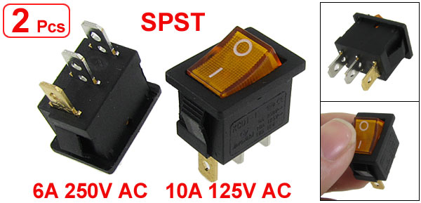2pcs Yellow Neon Light ON-OFF I/O SPST Rocker Switch 3 Pin 6A/250V 10A/125V AC