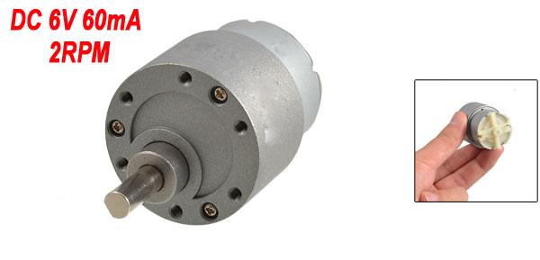Details2RPM Output Speed 37GB DC 6V 60mA 2-Pin Terminals Electric Geared Motor  Product Name DC Geared Motor Model Type 37GB Rated Voltage DC 6V Current 60mA Speed 2RPM Shaft Size 6 x 13mm/ 0.24" x 0.51"(D*H) Body Size 37 x 48mm / 1.4" x 1.9"(Max.D*H) Total Length 68mm / 2.7" Main Color Silver Tone Main Material Metal Weight 145g Package 1 x DC Geared Motor