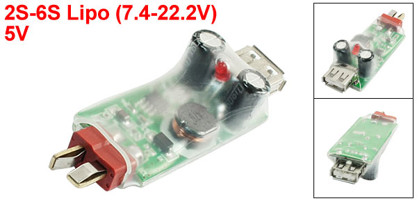 Product Name Li-ion Battery Conversion Charger Module for RC Plane, Phone Input Voltage 2S-6S Lipo (7.4-22.2V) Output Voltage 5V Input Type T Male Plug Output Type USB 2.0 Female Total Size 70 x 23 x 15mm/ 2.8" x 0.9" x 0.6"(L*W*H) Material Plastic, Electronic Part Net Weight 20g Package 1 x Li-ion Battery Conversion Charger Module - Reviews
