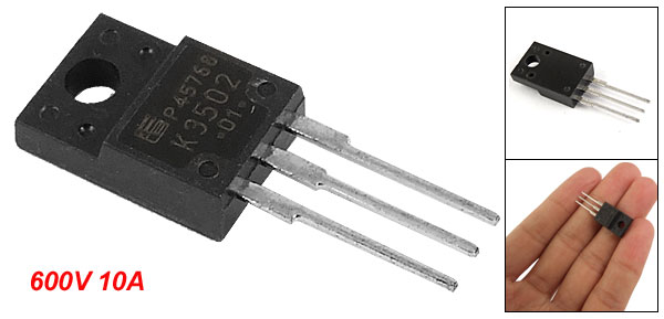 Product Name MOSFET Model No. 2SK3502 Channel Type N Channel Drain Source Voltage 600V Drain Current 10A Mounting Hole Diameter 3.2mm/ 1/8" Pin Size 13 x 2.5mm/ 0.51" x 0.11" ( L* Pitch) Total Size 29 x 10 x 4.5mm/ 1.14" x 0.39" x 0.18" (L*W*H) Weight 2g Package 1 x N Channel MOSFET - Reviews