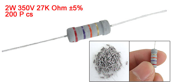 Product Name Carbon Film Resistors Material Type Carbon Film Rated Power 2W Resistance Value 27K ohm Tolerance ±5% Withstand Voltage 350V Total Size 59 x 5mm / 2.322" x 0.196" (L * D) Lead Diameter 0.4mm / 0.0157" Color As Picture Shown Weight 165g Package Content 200 Pcs (± 2%) x Carbon Film Resistors - Reviews