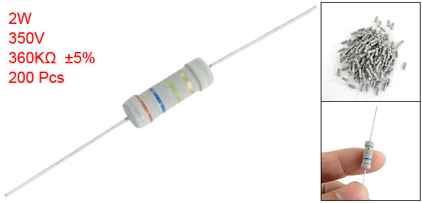 Product Name Carbon Film Resistors Material Type Carbon Film Rated Power 2W Resistance Value 360K ohm Tolerance ±5% Withstand Voltage 350V Total Size 59 x 5mm / 2.322" x 0.196" (L * D) Lead Diameter 0.4mm / 0.0157" Color As Picture Shown Weight 170g Package Content 200 Pcs (± 2%) x Carbon Film Resistors - Reviews