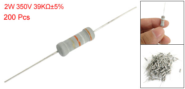 Product Name Carbon Film Resistors Material Type Carbon Film Rated Power 2W Resistance Value 39K ohm Tolerance ±5% Withstand Voltage 350V Total Size 59 x 5mm / 2.322" x 0.196" (L * D) Lead Diameter 0.4mm / 0.0157" Color As Picture Shown Weight 170g Package Content 200 Pcs (± 2%) x Carbon Film Resistors - Reviews