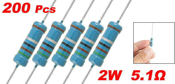 Product Name Metal Film Resistor Quantity 200±2% Pcs Rated Power 2W Tolerance ± 1% Resistance Value 5.1 Ω T.C.R(Temperature Coefficient) ±50ppm/°C Body Dimension 4.3 x 15mm/ 0.17" x 0.59" (D*L) Leads Dia (Approx.) 0.5mm/ 0.02" Total Length (Approx.) 73mm/2.87" Color As Picture Shown Net Weight 175g Package Content 200 Pcs x Metal Film Resistors - Reviews