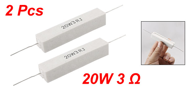 Product Name Cement Resistor Body Material Ceramic, Cement Power 20W Resistance 3Ω Tolerance ±5% (J) Body Size (Approx.) 64 x 13 x 12mm/2.5" x 0.51" x 0.47" (L * W * H) Lead Diameter (Approx.) 0.7mm / 0.027" Color White Weight 42g Package Content 2 x Cement Resistor - Reviews