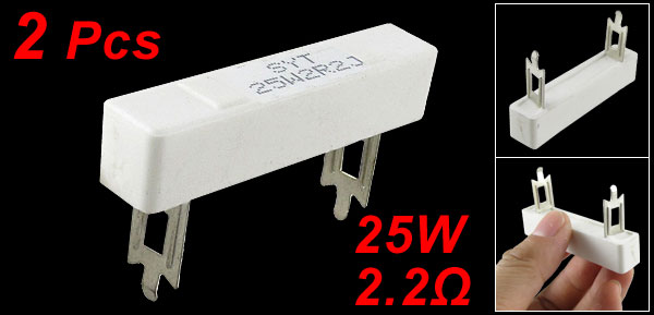 Details2x 2R2 2.2 ohm Wire Wound Ceramic Cement Resistors 2R2 5%  Product Name Cement Resistor Body Material Cement Power 25W Resistance 2.2Ω Tolerance ±5% Body Size (Approx.) 63 x 12 x 13mm / 2.48" x 0.47" x 0.51" (L * W * H) Pin Size (Approx.) 18 x 10mm / 0.71" x 0.4"(L*W) Color White Weight 48g Package Content 1 x Cement Resistor