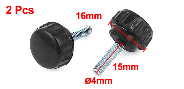 Product Name Straight Knurled Knob Type Screw On Head Diameter 16mm / 0.63" Thread Size 4 x 15mm / 0.16" x 0.59"(D*L) Total Height 27mm / 1.1" Material Metal, Plastic Color Silver Tone, Black Total Weight 11g Package Content 2 x Straight Knurled Knob - Reviews