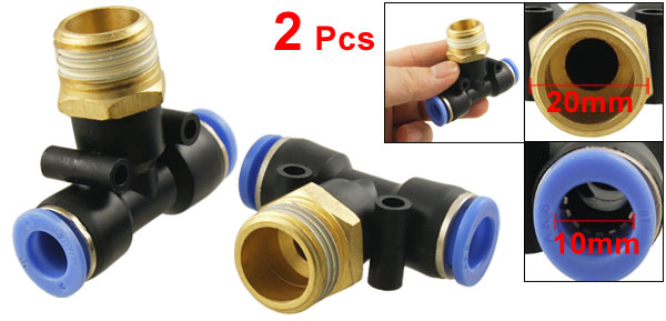 Product Name Pneumatic Quick Fittings Type T Connector One Touch Connector 10mm/ 0.39" Male Thread OD 20mm/ 0.79" Thread Size 1/2" Material Plastic, Metal Dimension (Approx) 5.1 x 4.2 x 1.8cm/ 2" x 1.65" x 0.71" (L*W*T) Color Black, Blue Weight 80g Package Content 2 x Pneumatic Quick Fittings - Reviews