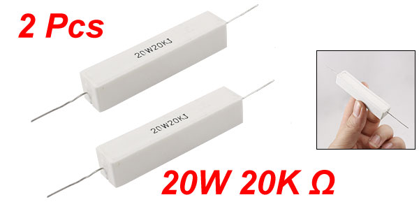 Product Name Cement Resistor Body Material Ceramic, Cement Power 20W Resistance 20K Ω Tolerance ±5% (J) Body Size (Approx.) 63 x 12 x 12mm/2.48" x 0.47" x 0.47" (L * W * H) Lead Diameter (Approx.) 0.7mm / 0.027" Color White Weight 45g Package Content 2 x Cement Resistor - Reviews