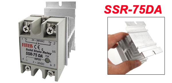 Product Name Solid State Relay Model SSR-75DA Material Metal, Aluminum, Plastic Input 3-32V DC Output 24-380V AC Rated Current 75A Total Size (Approx.) 8 x 5 x 7.3cm / 3.1" x 1.9" x 2.8" (L * W * H ) Color As Picture Shown Weight 214g Package Content 1 x Solid State Relay - Reviews