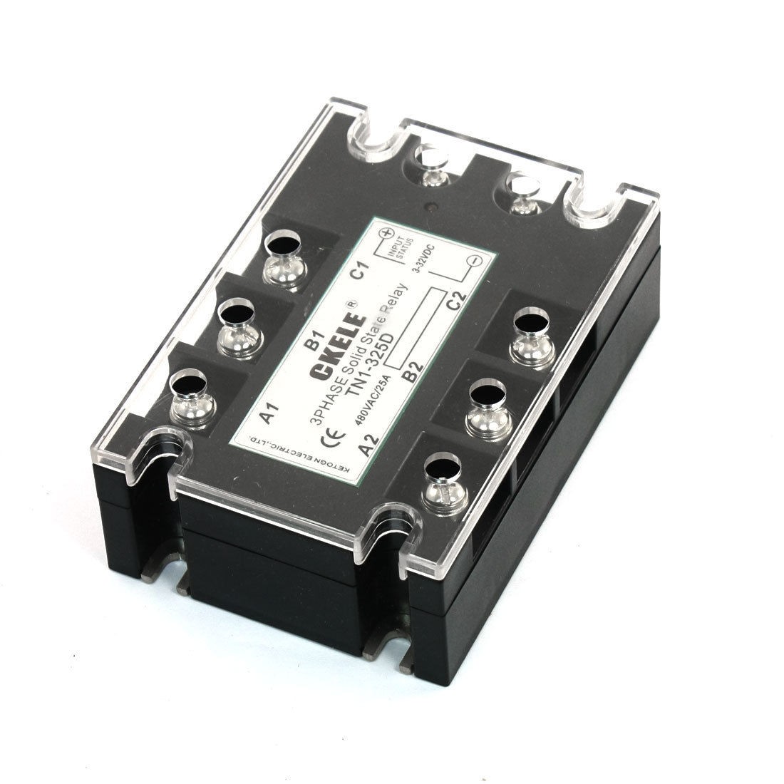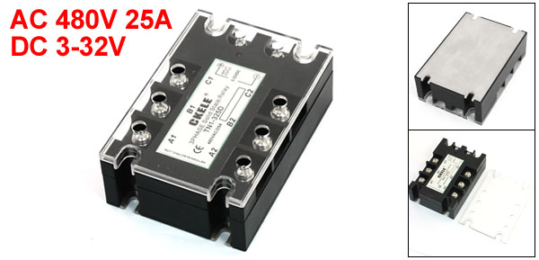 Product Name Solid State Relay Model No. TN1/325D Input 3-32VDC Output 480VAC 25A Pole Numbers 3P Size (Approx.) 104 x 73 x 35 / 4.1" x 2.9" x 1.4" (L*W*T) Main Color Black, Silver Tone Material Metal, Plastic, Electric Parts Weight 262g Package Content 1 x Solid State Relay