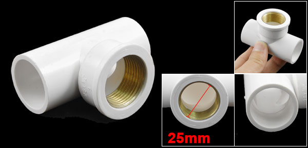 Product Name Pipe Connector Type 3 way Female Thread Dia (Approx.) 3/4" PT (25mm / 0.984") Overall Size (Approx.) 72x 32 x 50mm / 2.8" x 1.3" x 2"(L*W*H) Material PVC, Brass Color White Weight 54g Package Content 1 x Pipe Connector - Reviews