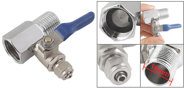 Product Name Ball Valve Type T Shape Thread Diameter(Male, Female) 19mm/ 3/4" Branch Hole Diameter 0.177mm/ 3/8" Level Handle Size 46 x 12mm/ 1.8" x 0.5" (L*W) Overall Size 47 x 58 x 30mm/ 1.85" x 2.28" x 1.2" (L*W*H) Color Blue& Silver Tone Material Brass & Metal Weight 94g Package 1 x Ball Valve - Reviews
