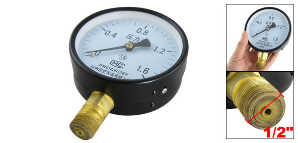 Product Name Pressure Gauge Pressure Intensity 0 - 1.6Mpa Accuracy Class Class 1.6 Thread Diameter 19mm/ 1/2" Case Size 98 x 40mm/ 3 7/8" x 1 5/8"(D*T) Main Color Black, White, Gold Tone Shell Material Metal Net Weight 106g Package 1 x Air Pressure Gauge - Reviews