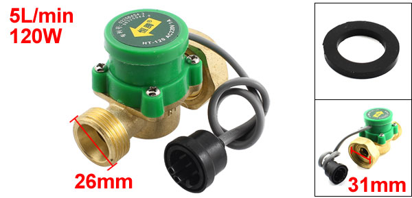 Country of Manufacture CHINA Male Thread Dia 26mm/ 3/4BSP Female Thread Dia 31mm/ 1BSP Power 120W Material Metal Wire Length 27cm/10.6" Working Voltage AC 220V 1A Product Name Water Flow Switch Net Weight 216g Package Content 1 x Water Flow Switch Max. Water Pressure 0.6Mpa Flow Characteristic 5L/min Body Size 72 x 40 x 54mm/2.8" x 1.6" x 2.2"(L*W*H) - Reviews