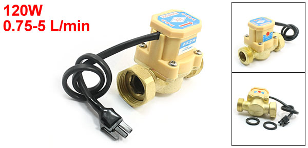 Product Name Water Flow Sensor Switch Max Load Power 120W Working Flow Rating 0.75-5 L/min Max Withstand Water Pressure <0.6Mpa Male Port Thread Dia 26mm/3/4PT Female Port Thread Dia 25mm /3/4PT Body Size 67 x 40 x 57mm / 2.7" x 1.6" x 2.3"(L*W) Cable Length 25cm /9.8" Material Brass Color Gold Tone Weight 180g Package Content 1 x Water Flow Sensor Switch - Reviews