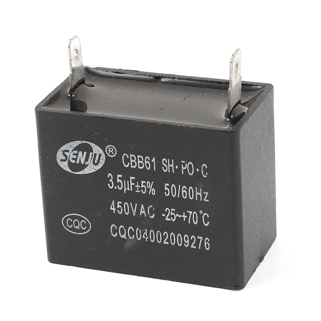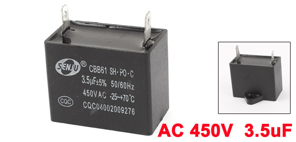 Product Name Motor Capacitor Housing Material Plastic Dielectric Material Metallized Polypropylene Film Model CBB61 Capacitance 3.5uF Tolerance +/-5% Rated Voltage AC 450V Frequency 50/60Hz Temperature 25/70/21 Pin Spacing(Approx.) 3.3cm/1.3" Overall Size 40 x 24 x 33mm/1.6" x 1.0" x 1.3"(L*W*H) Color Black Weight 38g Package Content 1 x Motor Capacitor - Reviews