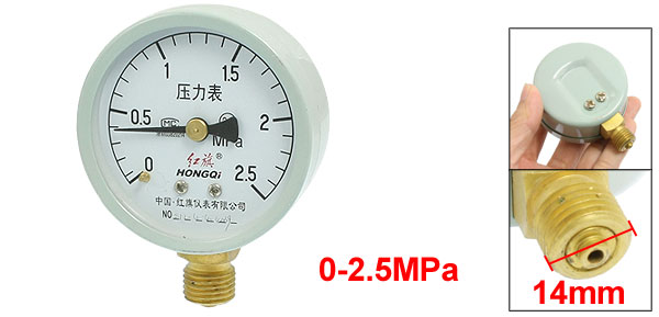 Product Name Pressure Gauge Range 0-2.5MPa Accuracy Class Class 2.5 Total Size 81 x 60 x 29mm/ 3.2" x 2.4" x 1.1" ((L*D*T) Thread Diameter 3/8" NPT(14mm) External Material Metal Color As Picture Shown Net Weight 115g Package Content 1 x Pressure Gauge - Reviews