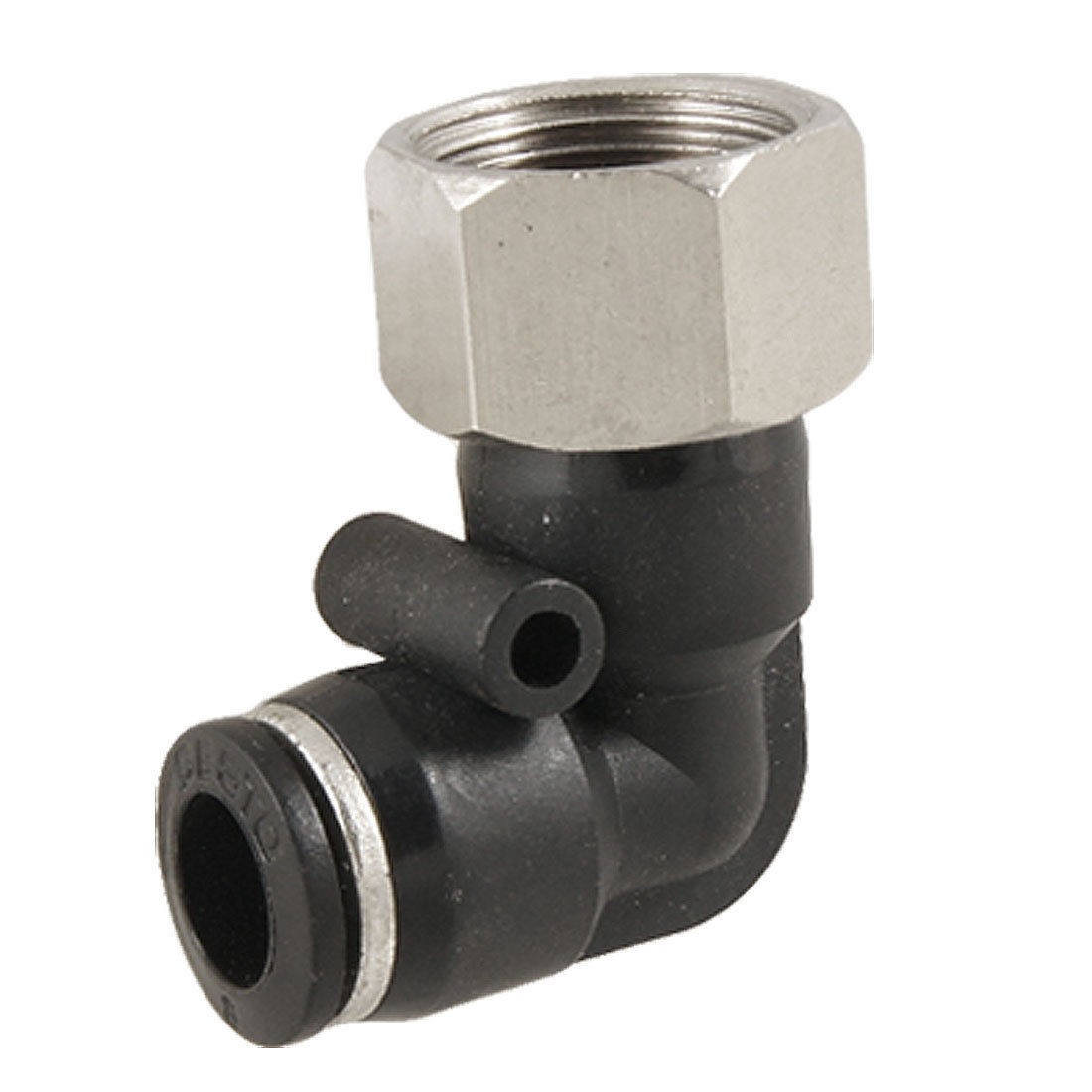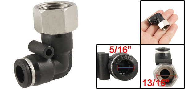 Details3/8" F Thread 8mm One Touch Connector Quick Fittings  Product Name Pneumatic Quick Fittings Type Elbow Type One Touch Connector 8mm/ 5/16" Thread Connector 3/8" PT (16.4mm) Material Plastic & Metal Size (Approx) 3.7 x 3 x 2.2cm/ 1.46" x 1.18" x 0.87" (L*W*T) Color Black, Silver Tone Weight 20g Package Content 1 x Pneumatic Quick Fittings