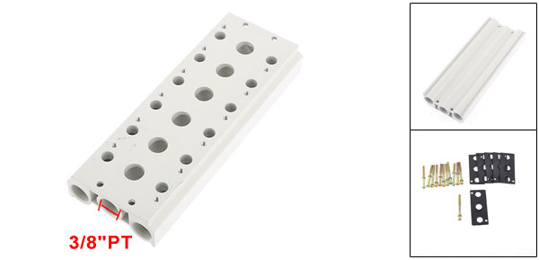 Product Name Solenoid Valve Base Stations 6 Nominal Bore Diameter 13.2mm/ 0.52" Port Female Thread Diameter 14.95mm/ 3/8"PT Mounting Hole Diameter 3.5mm / 0.14" Mouting Hole Distance(center to center) 5.1x 2.5mm / 2" x 1"(L*W) Dimension(Approx.) 20 x 7.4 x 2.7cm / 7.9" x 2.9" x 1.1" (L*W*T) Material Aluminum Color Ivory Weight 413g Package Content 1 x Solenoid Valve Base