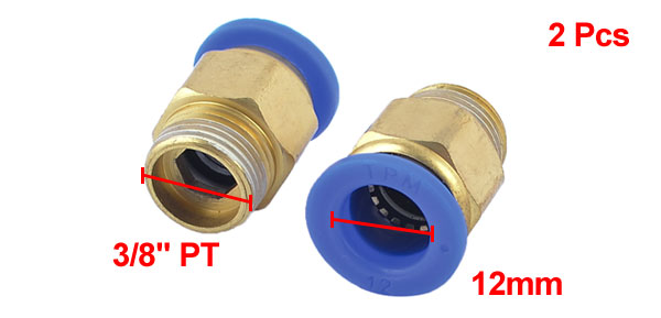 Details3/8" PT Male Thread to 12mm Hole Straight Push in Pneumatic Quick Coupler 2pcs  Item Name Quick Coupler Overall Size 28 x 21mm/ 0.9" x 0.83"(L*W) Inner Diameter (Blue End) 12mm/ 0.47" Male Thread Size 3/8" PT Main Material Brass, Plastic Color Gold Tone, Blue Weight 34g Package Content 2 x Quick Coupler