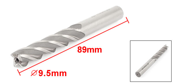 Product Name End Mill Cutter Material HSS Flute Number 4 Flutes Cutting Diameter 9.5mm/ 3/8" Shank Diameter 9.5mm/ 3/8" Cutting Depth 50mm/ 2" Total Length 89mm/ 3.5" Mill Cutter Color Gray Weight 43g Package Content 1 x Straight Shank End Mill Cutter