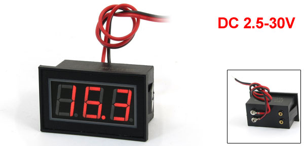 Product Name Potting Waterproof Digital Voltmeter Model V56D Display 3 Digits Red LED Voltage Range DC 2.5-30V Total Size 50 x 30 x 27mm/2" x 1.2" x 1.1"(L*W*T) Mounting Size 47 x 29mm/ 1.9" x 1.1"(L*W) Cable Length 20cm / 7.9" External Material Plastic Main Color Black Weight 39g Package Content 1 x Potting Waterproof Digital Voltmeter - Reviews