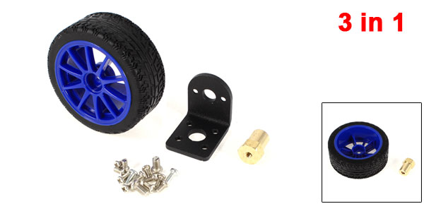Details3 in 1 DC Reduction Motor Bracket Tyre Tire Wheel Hex Coupler Set for Smart Car  Product Name DC Motor Bracket + Hex Coupler + Wheel Fit Model for 25mm Geared Motor Bracket Size 33 x 33 x 27mm/ 1.3" x 1.3" x 1"(L*W*H) Hole Dia. 3.5mm / 0.14" 3mm/ 0.12" 8mm/0.31" Wheel Size 65 x 26mm/2.6" x 1"(D*H) Hex Coupler Size 18 x 12mm/ 0.71" x 0.47"(L*Max.W) Material Metal,Plastic,Rubber Color Blue,Black,Gold Tone ,Silver Tone Weight 65g Package Content 1 x DC Motor Bracket
