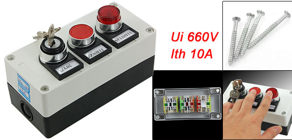 Product Name Keylock Rotary Push Button Switch Material Plastic, Metal Ui 660V Ith 10A Action Type Red Light Push Button Switch : Momentary Flat Push Button Switch: Self Locking Indicator Light Voltage DC 24V Rotary Switch Mode 3 Position on/off/on Overall Size(not include button) 15x 7 x 6.5cm/ 5.9" x 2.8" x 2.5" (L*W*H) Knob Diameter 2.5cm/1" Mounting Hole Diameter 5mm/ 0.2" Color Orange, Red, White, Black Button Color Red Weight 320g Package Content 1 x Push Button Switch Station 2 x Keys - Reviews