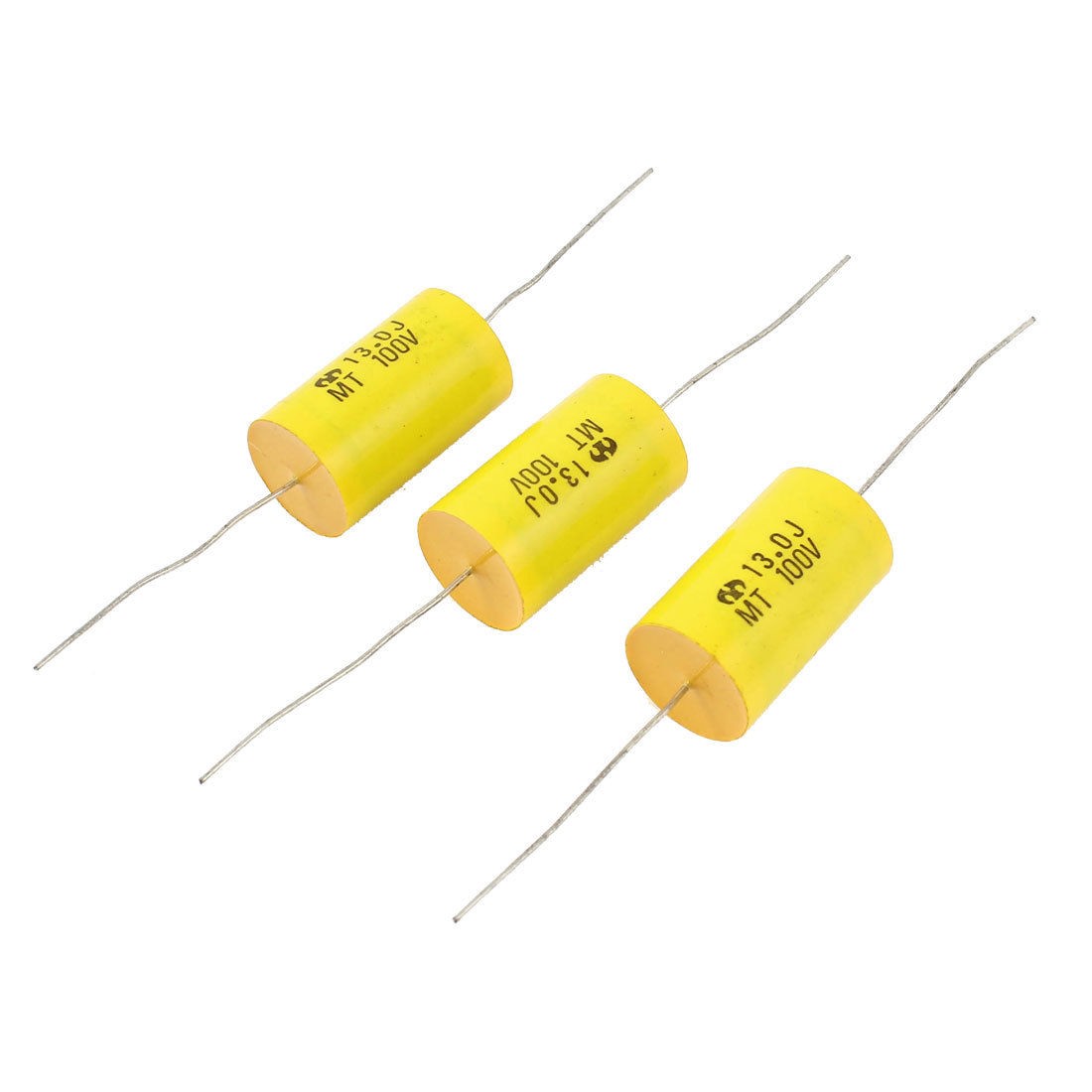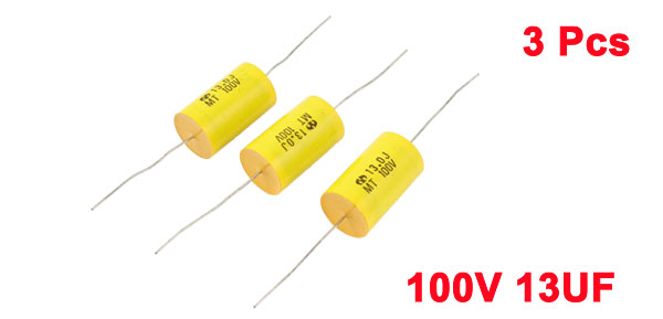 Product Name Electrolytic Capacitor Type Axial Lead Features Standard General Purpose Withstand Voltage 100V Capacitance 13UF Body Size 17 x 30mm / 0.67" x 1.18" (D*L) Lead Length 40mm/ 1.6“ Dielectric Material Aluminum Weight 29g Color Yellow Package Content 3 Pcs x Electrolytic Capacitors