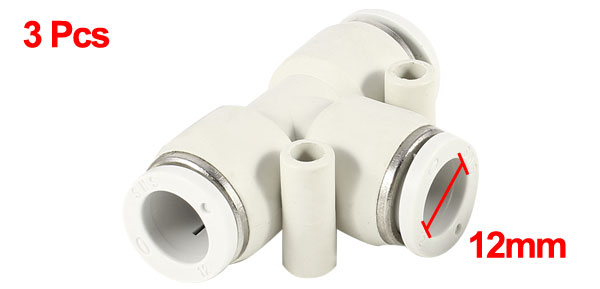3 Pcs 12mm to 12mm T Type 3 Ports Air Pneumatic Quick Fitting Connectors White