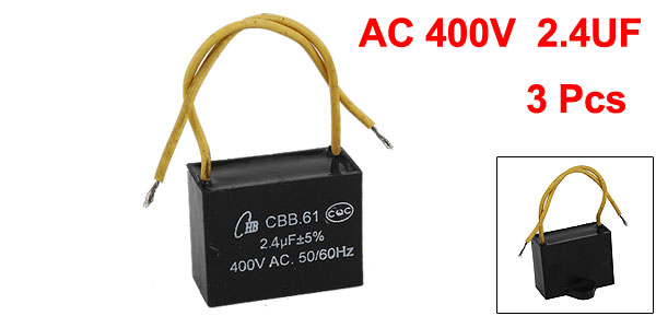 Product Name Motor Capacitor Model CBB61 External Material Plastic Dielectric Material Metalized Polypropylene Rated Capacitance 2.4uF Tolerance ±5% Rated Frequency 50/60Hz Rated Voltage AC 400V Size 3.7 x 2.8 x 1.8cm/ 1.4" x 1.1" x 0.7"(L*W*T) Hole Dia. 4.5mm/ 0.18" Cable Length 10cm/ 3.6" Weight 60g Package Content 3 x Motor Run Capacitor - Reviews