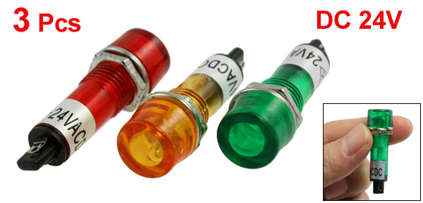 Product Name Indicator Light Lamp Holder Type 2 Pins Voltage DC 24V Light Color Green, Orange, Red Size 11 x 40mm/ 0.43" x 1.6" (D*L) Mount Hole Diameter 9.5mm/ 0.374" Material Plastic, Metal Color Green, Orange, Red Weight 10g Package Content 3 x Indicator Lights - Reviews