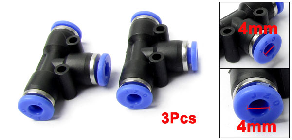 Product Name Pneumatic Quick Fitting Connector Type 4mm to 4mm (T-shaped) Material Plastic Size (Approx) 38 x 24 x 18mm / 2" x 1.4" x 0.7" (L*W*H) Color Black, Blue Weight 14g Package Content 3 x Pneumatic Quick Fitting - Reviews