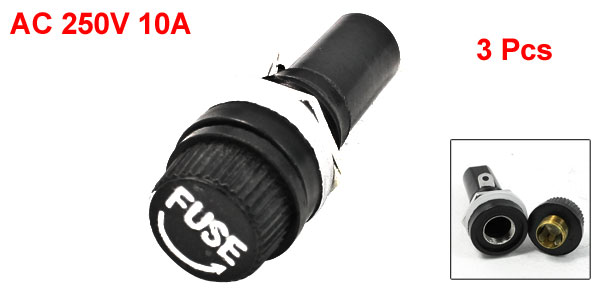 Item Name Panel Mounted Fuse Holder Fit for 6 x 30mm / 0.23" x 1.1" Fuses Maxi. Withstand 10A 250VAC Material Plastic and Metal Color Black Size 1.6 x 4.3cm / 0.63" x 1.6" ( Diameter * Length) Weight 27g Package Content 3 x Panel Mount Fuse Holder - Reviews
