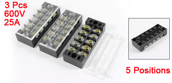 3 Pcs 600V 25A 5 Positions 5P Dual Rows Covered Barrier Screw Terminal Block