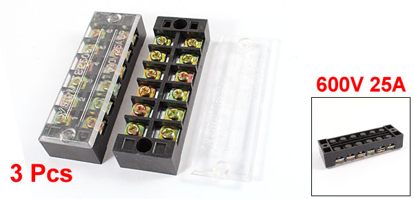 3 Pcs 600V 25A 6 Positions 6P Dual Rows Covered Barrier Screw Terminal Block